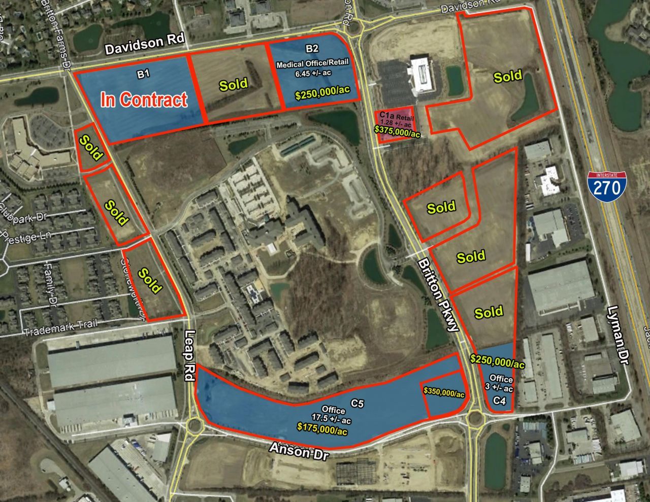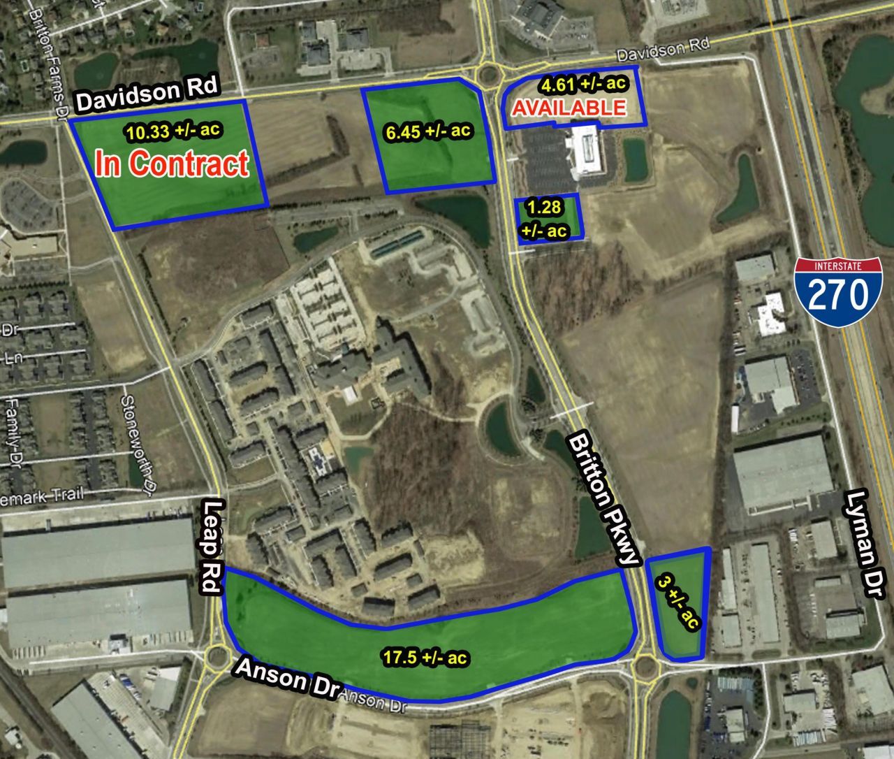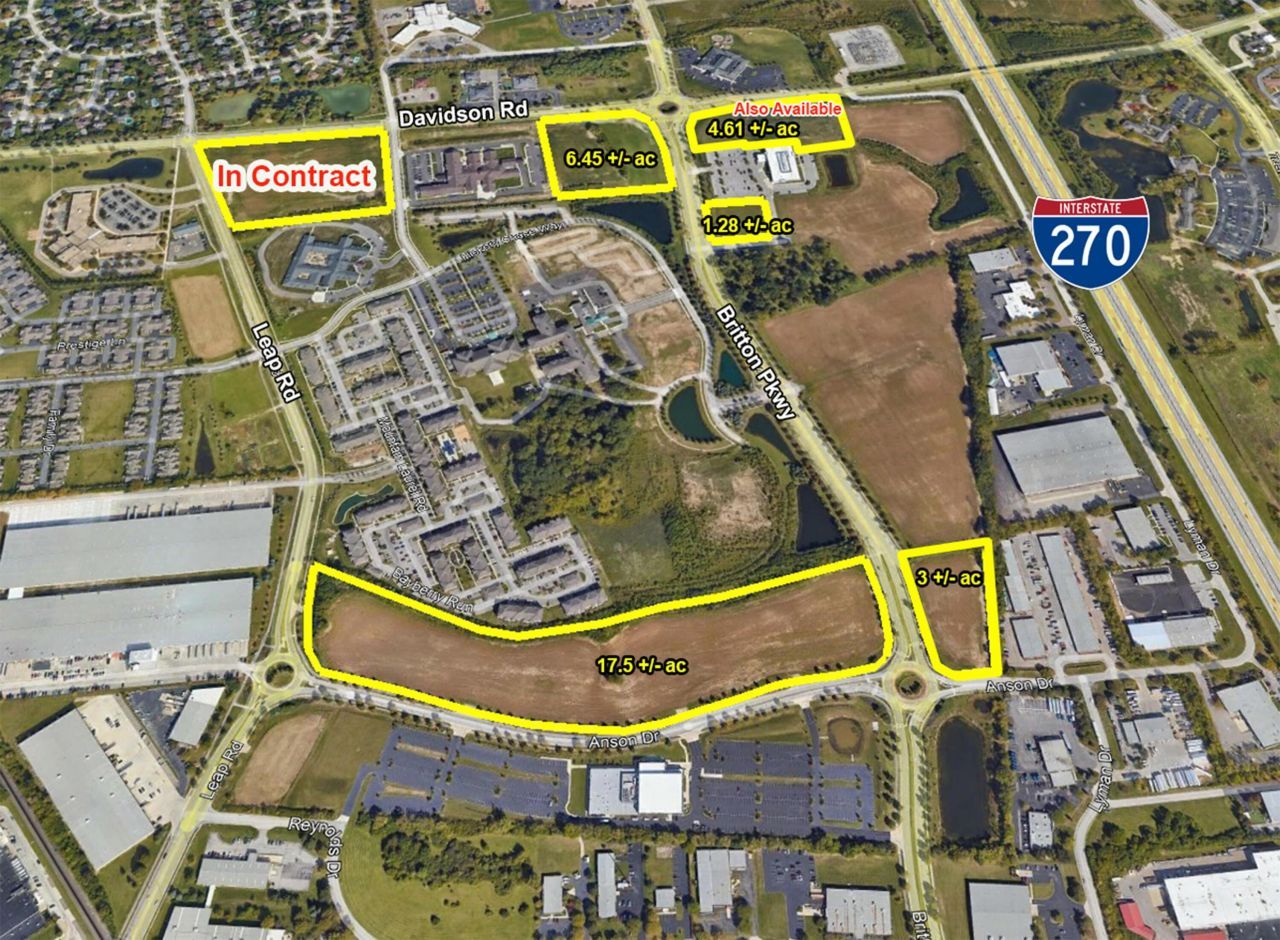 Located at the southwest corner of I-270 and Davidson Road. Land available along Davidson Road, Leap Road, Britton Parkway and Anson Dr. City of Hilliard. Many different areas available with potential sites for multiple users. Prices are $175,000- $375,000 per acre depending on location. Lots from 1.28 +/- Acres to 17.5 +/ Acres. Great development opportunity a total of 38.56. 10.33 +/- acres (Lot B1) is currently in contract.