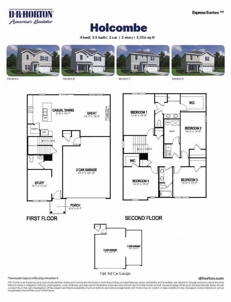 Discover your future home in Lakefield Place by D.R. Horton! The Holcombe is a delightful 2,356 sq. ft. two-story house, perfectly combining comfort and practicality with a touch of modern elegance. The layout features an open-concept kitchen, dining, and living area, ideal for both entertaining guests and everyday living, all enhanced by 9-foot ceilings throughout the first floor. The kitchen is equipped with a large island, granite countertops, stainless steel appliances, elegant 36 cabinetry, and a walk-in pantry. At the front of the home is a large study, perfect for at home office, and the first floor is completed by a powder room. Upstairs, youll find all four bedrooms, including a generous primary suite with a walk-in closet and dual vanity sinks in the en-suite bath. Upstairs also comes equipped with a laundry room.